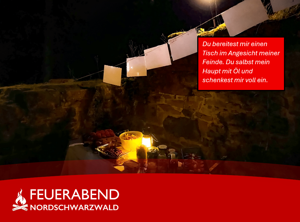 Du bereitest mir einen Tisch im Angesicht meiner Feinde. Du salbst mein Haupt mit Öl und schenkest mir voll ein.